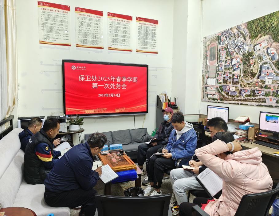 最后,刘城炜处长对此次学习和近期工作进行了总结,并结合保卫处工作实际对迎评期间学校安全保卫工作提出要求:必须持之以恒加强门卫管理、保安队伍形象整顿、要强化校园交通、治安秩序整治、加强校园安全隐患排查力度、坚决落实24小时值班值守巡查制度、强化校内无死角巡检、增设交通安全设施、加强消防安全检查、加强对防灾减灾、交通安全、防电信诈骗等工作的宣传教育。部门各科室要根据职责分工,将责任分配到个人,协同开展,提高工作成效和质量,确保学校迎评期间校园安全稳定。刘城炜处长指出,全体人员必须深刻理解和准确把握会议精神实质,明确自身工作职责,理清工作思路、锚定工作目标、优化工作计划,严格按照学校整体部署要求推进工作内容,加快准备审核评估筹备工作,把各项措施落到实处,以饱满的热情、积极的状态以及优质的工作成效来迎接审核评估。