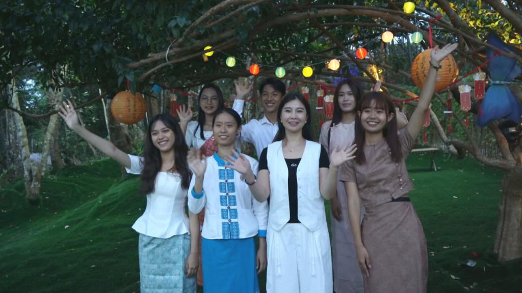 活动尾声,中国学生展开“茶咖明月夜,澜湄一家亲”毛笔字横幅,六国学生共读并以母语送中秋祝福,从中文到老挝语、泰语、缅甸语、柬埔寨语、越南语,不同语言的祝福混在一起,笑声与月光交织,定格成温馨的跨国团圆图景。